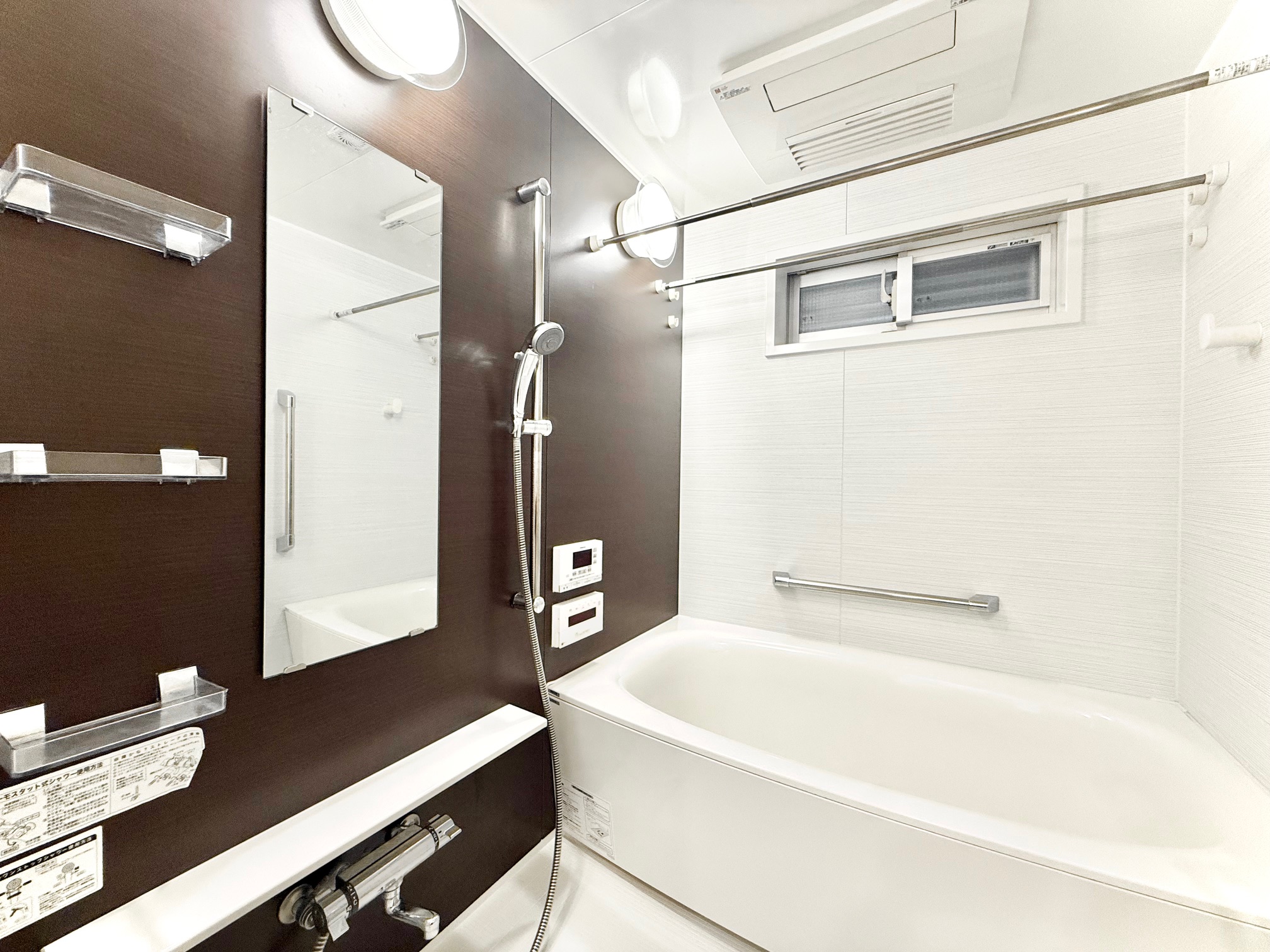 スタイリッシュな壁面が印象的な浴室。浴室換気乾燥機が設置されており、天候の悪い日の洗濯時も屋内干しが可能です。換気機能の利用で、カビ抑制にも効果的です。