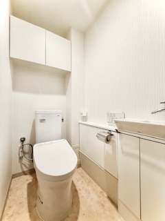 温水洗浄便座付きで、快適にご使用いただけます。トイレ上部と手洗い下部に収納があり、トイレットペーパーやお掃除用品も収納可能です。