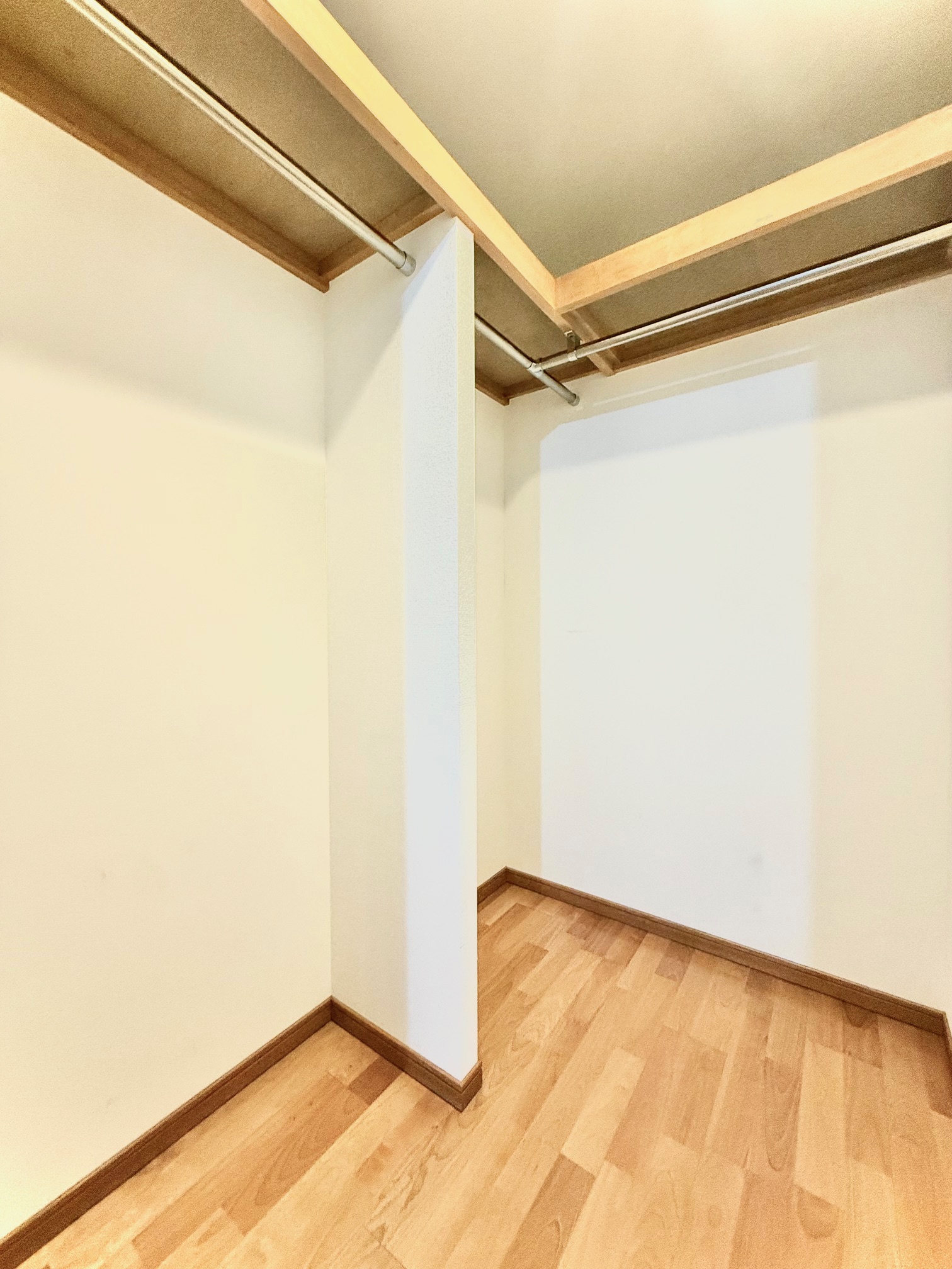 ハンガーパイプがあり、洋服を掛けて保管しておくことができます。上部の棚にはカバンなどの小物類を収納できます。スペースがあるため、スーツケースといった大きな物も収納可能です。