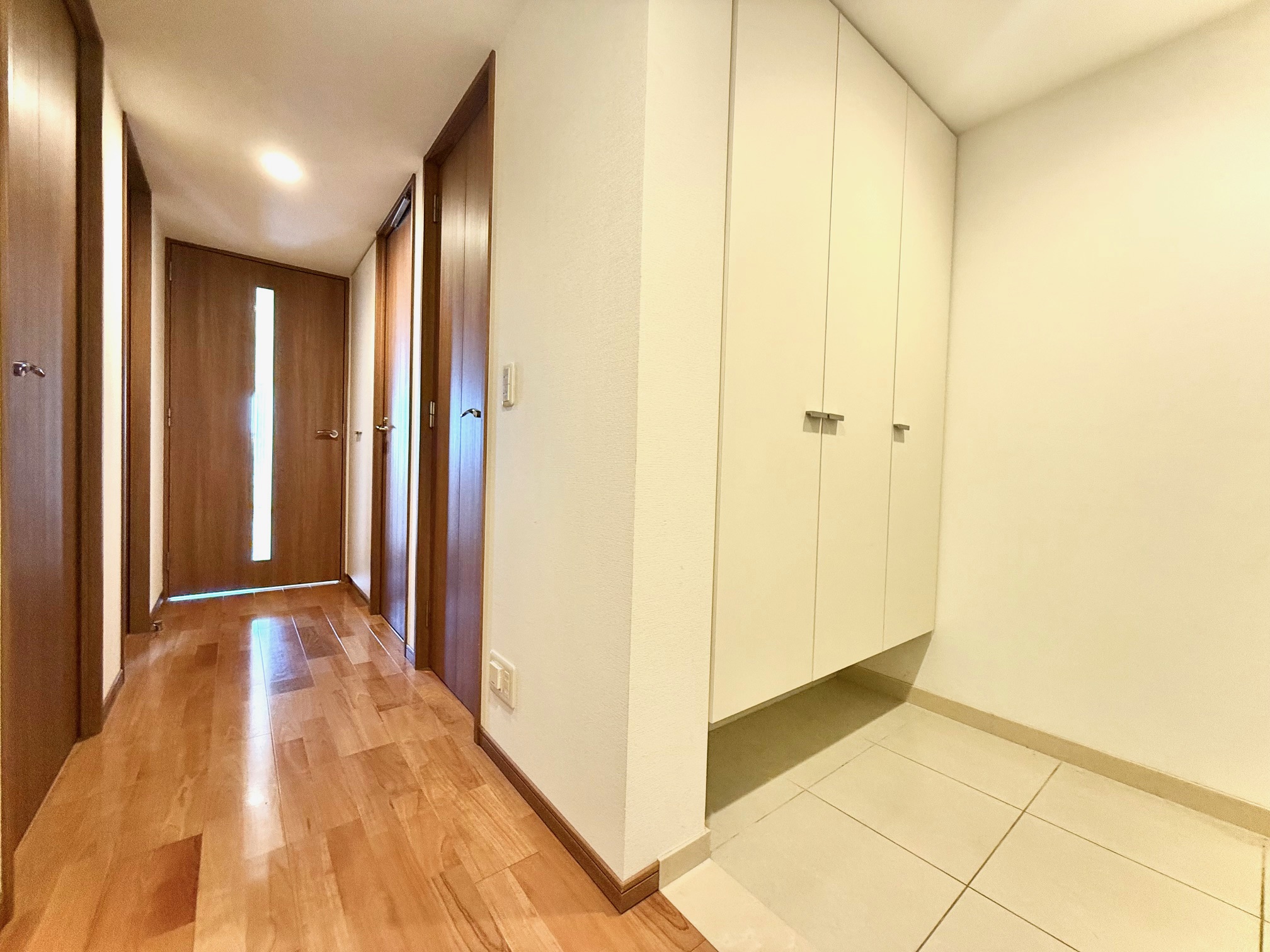 白を基調とした清潔感のある玄関スペースです。玄関からは室内が見えにくいクランクイン動線で、プライバシーに配慮された設計です。
